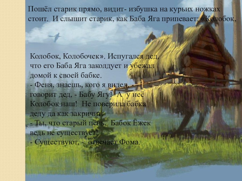 Слайд 17Пошёл старик прямо, видит- избушка на курьих ножках стоит. И слышит