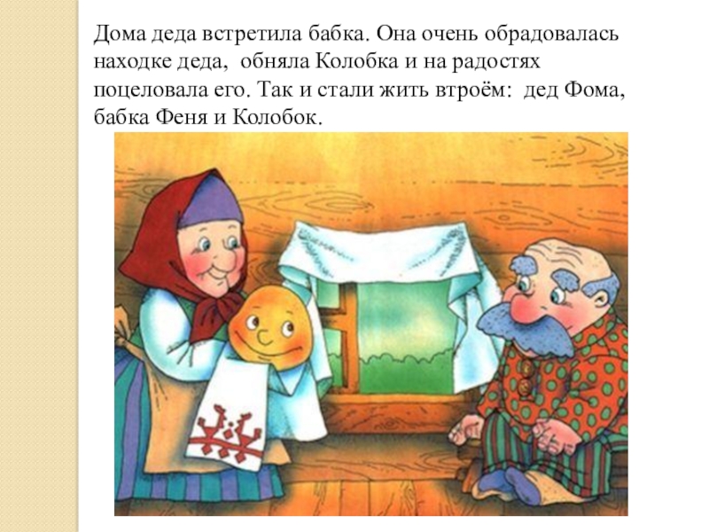 Слайд 21Дома деда встретила бабка. Она очень обрадовалась находке деда, обняла Колобка