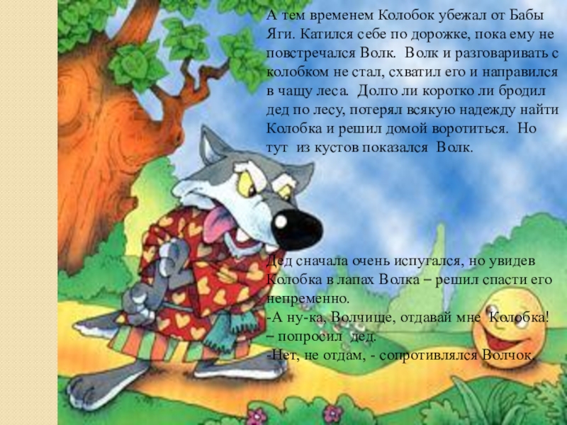 дорожке, пока ему не повстречался Волк. Волк и разговаривать с колобком не стал, схватил его и направился в чащу леса. Долго ли коротко ли бродил дед по лесу, потерял всякую надежду найти Колобка и решил домой воротиться. Но тут из кустов показался Волк.