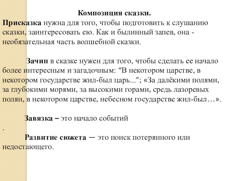 Зачин в сказке нужен для того, чтобы сделать ее начало более интересным и загадочным: “В некотором царстве, в некотором государстве жил-был царь...”; «За далёкими полями, за глубокими морями, за высокими горами, средь лазоревых полян, в некотором царстве, небесном государстве жил-был…».