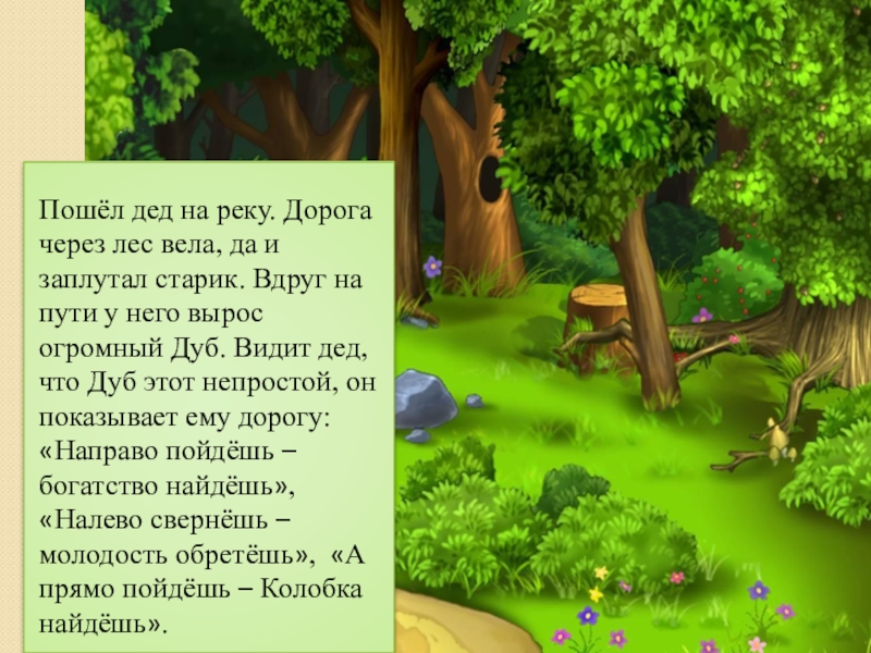 старик. Вдруг на пути у него вырос огромный Дуб. Видит дед, что Дуб этот непростой, он показывает ему дорогу: «Направо пойдёшь – богатство найдёшь», «Налево свернёшь – молодость обретёшь», «А прямо пойдёшь – Колобка найдёшь».