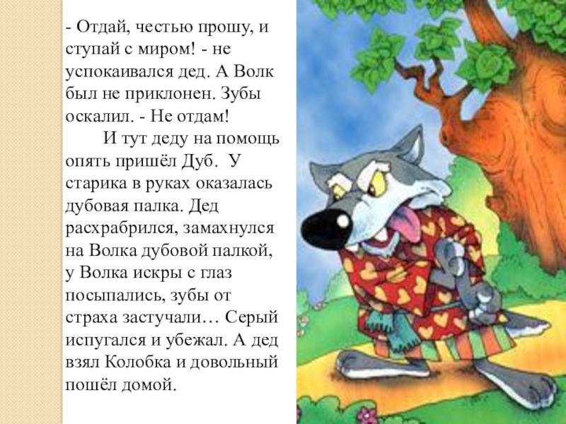 И тут деду на помощь опять пришёл Дуб. У старика в руках оказалась дубовая палка. Дед расхрабрился, замахнулся на Волка дубовой палкой, у Волка искры с глаз посыпались, зубы от страха застучали… Серый испугался и убежал. А дед взял Колобка и довольный пошёл домой.