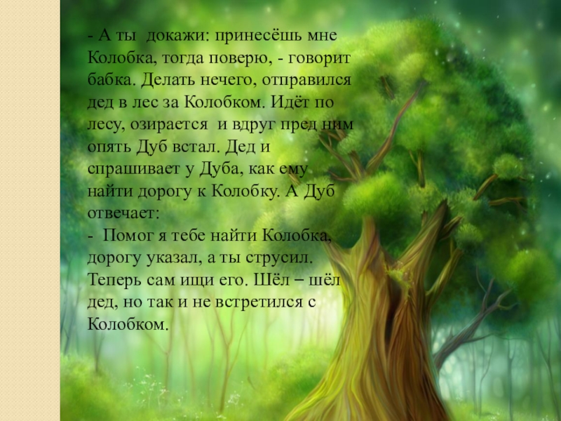 бабка. Делать нечего, отправился дед в лес за Колобком. Идёт по лесу, озирается и вдруг пред ним опять Дуб встал. Дед и спрашивает у Дуба, как ему найти дорогу к Колобку. А Дуб отвечает: