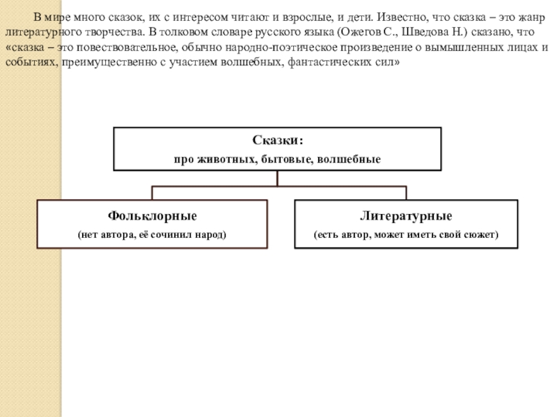 дети. Известно, что сказка – это жанр литературного творчества. В толковом словаре русского языка (Ожегов С., Шведова Н.) сказано, что «сказка – это повествовательное, обычно народно-поэтическое произведение о вымышленных лицах и событиях, преимущественно с участием волшебных, фантастических сил»
