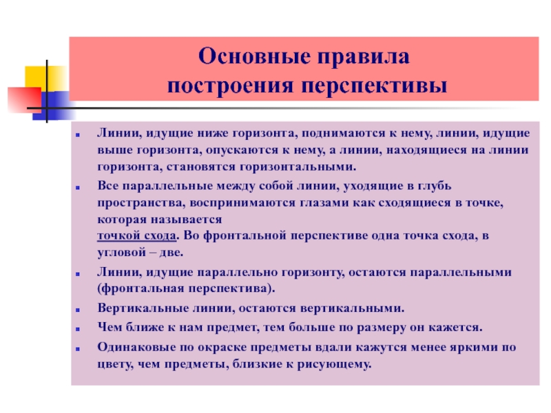 Основные правила  построения перспективыЛинии, идущие ниже горизонта, поднимаются к нему, линии, идущие выше горизонта, опускаются к