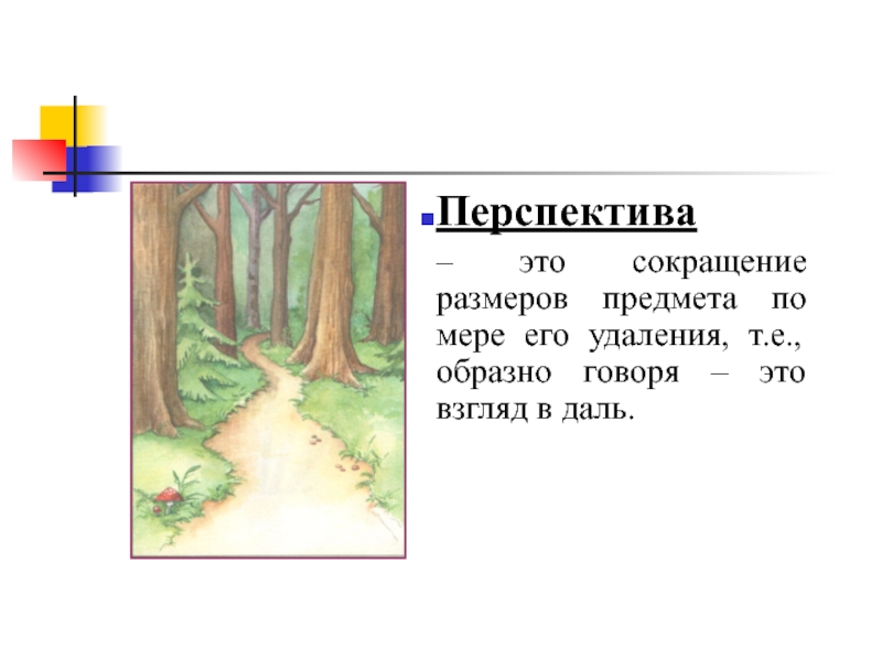 Перспектива – это сокращение размеров предмета по мере его удаления, т.е., образно говоря – это взгляд в даль.