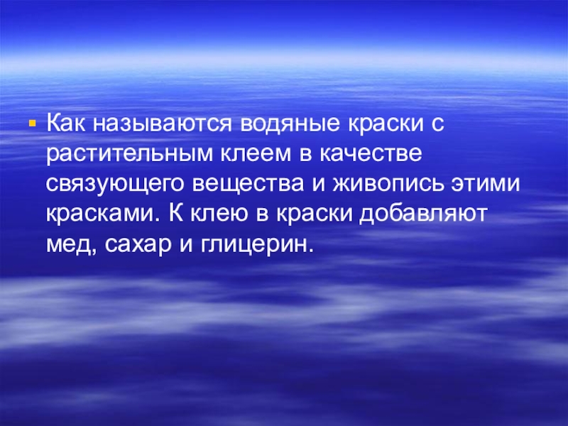 Слайд 2Как называются водяные краски с растительным клеем в качестве связующего вещества