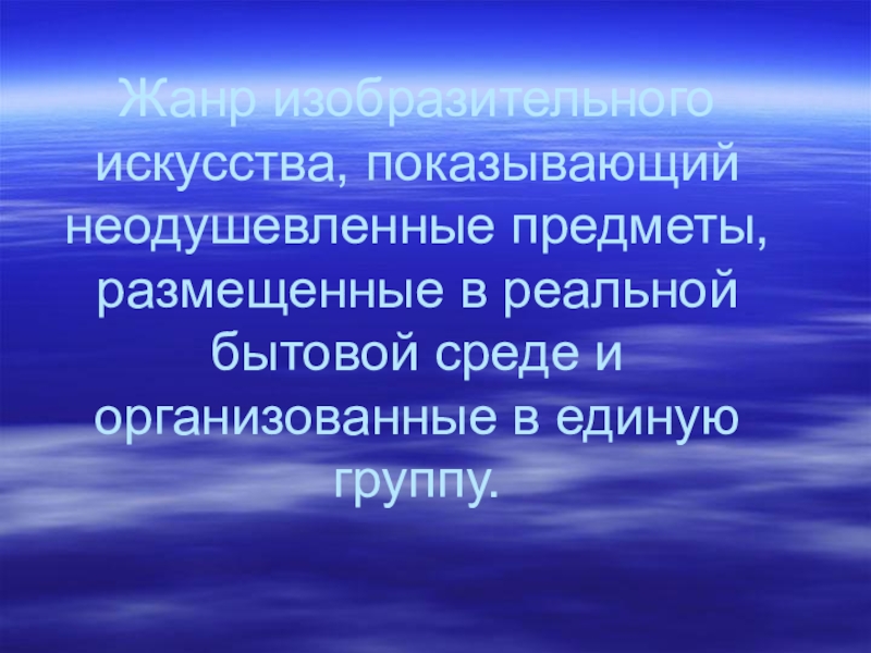 Слайд 4Жанр изобразительного искусства, показывающий неодушевленные предметы, размещенные в реальной бытовой среде