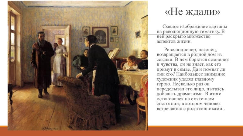 И. Е. Репин родился в г. Чугуеве, расположенном на территории Харьковской губернии, в 1844 году. И никому тогда в голову не могло даже прийти, что этот обычный мальчишка из бедной семьи станет великим русским художником. Мать первая заметила его способности в то время, когда он помогал ей, готовясь к Пасхе, расписывать яйца. Как ни радовалась мать такому таланту, на его развитие денег у нее не было. Илья Репин накопил денег, работая иконописцем в церкви в течении 4 лет, после чего поехал и поступать в Академию художеств.