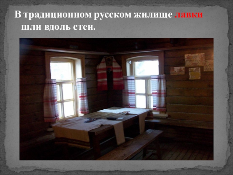 Слайд 13В традиционном русском жилище лавки шли вдоль стен.