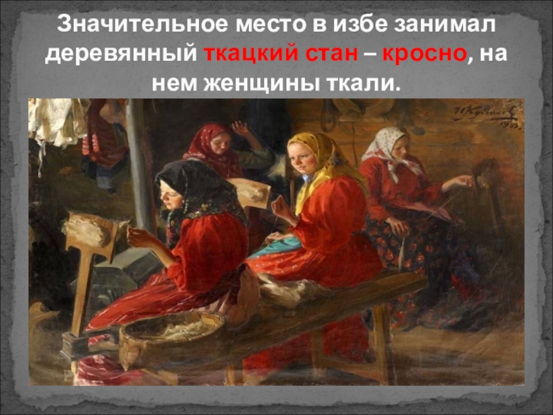 Слайд 17Значительное место в избе занимал деревянный ткацкий стан – кросно, на