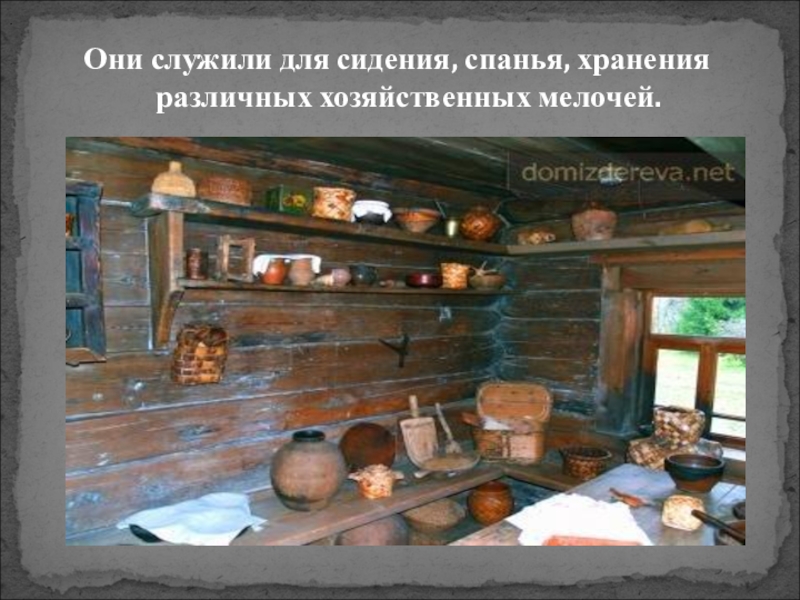 Слайд 14Они служили для сидения, спанья, хранения различных хозяйственных мелочей.
