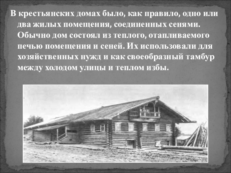Слайд 2В крестьянских домах было, как правило, одно или два жилых помещения,