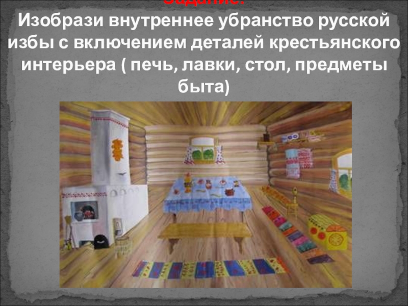 Слайд 19Задание: Изобрази внутреннее убранство русской избы с включением деталей крестьянского интерьера (