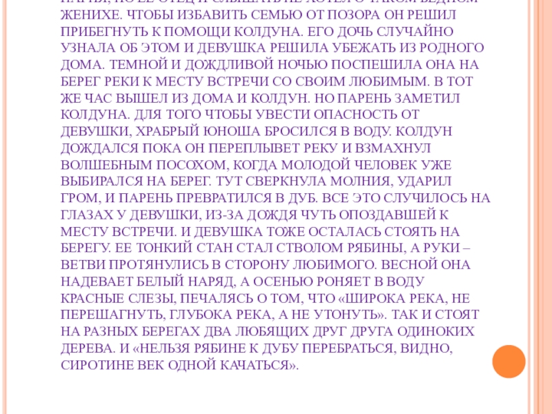 ОТЕЦ И СЛЫШАТЬ НЕ ХОТЕЛ О ТАКОМ БЕДНОМ ЖЕНИХЕ. ЧТОБЫ ИЗБАВИТЬ СЕМЬЮ ОТ ПОЗОРА ОН РЕШИЛ ПРИБЕГНУТЬ К ПОМОЩИ КОЛДУНА. ЕГО ДОЧЬ СЛУЧАЙНО УЗНАЛА ОБ ЭТОМ И ДЕВУШКА РЕШИЛА УБЕЖАТЬ ИЗ РОДНОГО ДОМА. ТЕМНОЙ И ДОЖДЛИВОЙ НОЧЬЮ ПОСПЕШИЛА ОНА НА БЕРЕГ РЕКИ К МЕСТУ ВСТРЕЧИ СО СВОИМ ЛЮБИМЫМ. В ТОТ ЖЕ ЧАС ВЫШЕЛ ИЗ ДОМА И КОЛДУН. НО ПАРЕНЬ ЗАМЕТИЛ КОЛДУНА. ДЛЯ ТОГО ЧТОБЫ УВЕСТИ ОПАСНОСТЬ ОТ ДЕВУШКИ, ХРАБРЫЙ ЮНОША БРОСИЛСЯ В ВОДУ. КОЛДУН ДОЖДАЛСЯ ПОКА ОН ПЕРЕПЛЫВЕТ РЕКУ И ВЗМАХНУЛ ВОЛШЕБНЫМ ПОСОХОМ, КОГДА МОЛОДОЙ ЧЕЛОВЕК УЖЕ ВЫБИРАЛСЯ НА БЕРЕГ. ТУТ СВЕРКНУЛА МОЛНИЯ, УДАРИЛ ГРОМ, И ПАРЕНЬ ПРЕВРАТИЛСЯ В ДУБ. ВСЕ ЭТО СЛУЧИЛОСЬ НА ГЛАЗАХ У ДЕВУШКИ, ИЗ-ЗА ДОЖДЯ ЧУТЬ ОПОЗДАВШЕЙ К МЕСТУ ВСТРЕЧИ. И ДЕВУШКА ТОЖЕ ОСТАЛАСЬ СТОЯТЬ НА БЕРЕГУ. ЕЕ ТОНКИЙ СТАН СТАЛ СТВОЛОМ РЯБИНЫ, А РУКИ – ВЕТВИ ПРОТЯНУЛИСЬ В СТОРОНУ ЛЮБИМОГО. ВЕСНОЙ ОНА НАДЕВАЕТ БЕЛЫЙ НАРЯД, А ОСЕНЬЮ РОНЯЕТ В ВОДУ КРАСНЫЕ СЛЕЗЫ, ПЕЧАЛЯСЬ О ТОМ, ЧТО «ШИРОКА РЕКА, НЕ ПЕРЕШАГНУТЬ, ГЛУБОКА РЕКА, А НЕ УТОНУТЬ». ТАК И СТОЯТ НА РАЗНЫХ БЕРЕГАХ ДВА ЛЮБЯЩИХ ДРУГ ДРУГА ОДИНОКИХ ДЕРЕВА. И «НЕЛЬЗЯ РЯБИНЕ К ДУБУ ПЕРЕБРАТЬСЯ, ВИДНО, СИРОТИНЕ ВЕК ОДНОЙ КАЧАТЬСЯ».