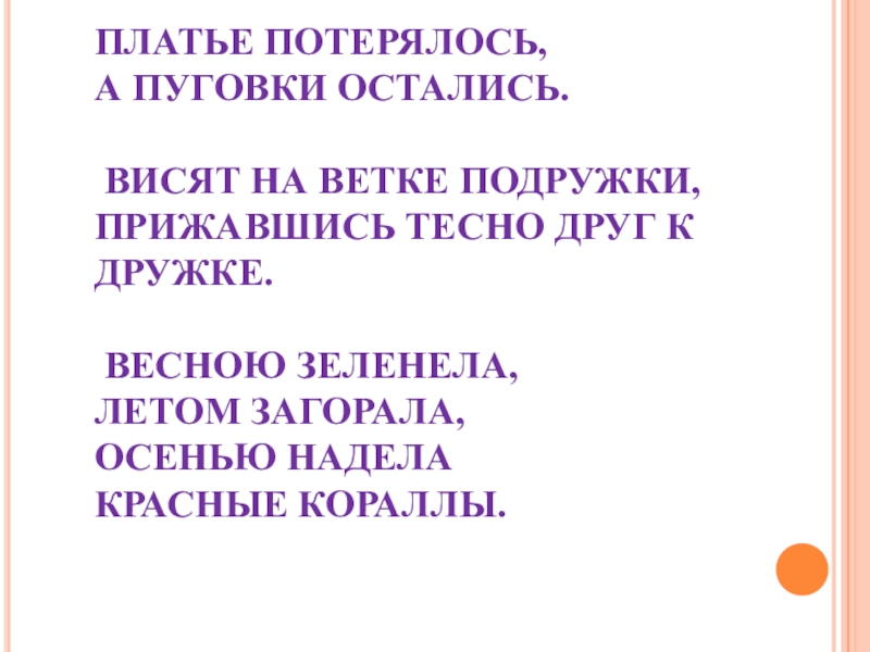 ПЛАТЬЕ ПОТЕРЯЛОСЬ, А ПУГОВКИ ОСТАЛИСЬ. ВИСЯТ НА ВЕТКЕ ПОДРУЖКИ, ПРИЖАВШИСЬ ТЕСНО ДРУГ К ДРУЖКЕ. ВЕСНОЮ ЗЕЛЕНЕЛА, ЛЕТОМ ЗАГОРАЛА, ОСЕНЬЮ НАДЕЛА КРАСНЫЕ КОРАЛЛЫ.