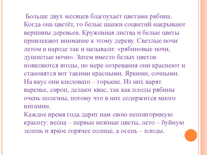 белые шапки соцветий накрывают вершины деревьев. Кружевная листва и белые цветы привлекают внимание к этому дереву. Светлые ночи летом в народе так и называли: «рябиновые ночи, душистые ночи». Затем вместо белых цветов появляются ягоды, по мере созревания они краснеют и становятся вот такими красными. Яркими, сочными. На вкус они кисловато – горькие. Из них варят варенье, сироп, делают квас, так как плоды рябины очень полезны, потому что в них содержится много витамин. Каждое время года дарит нам свою неповторимую красоту: весна – первые нежные цветы, лето – буйную зелень и яркое горячее солнце, а осень – плоды.