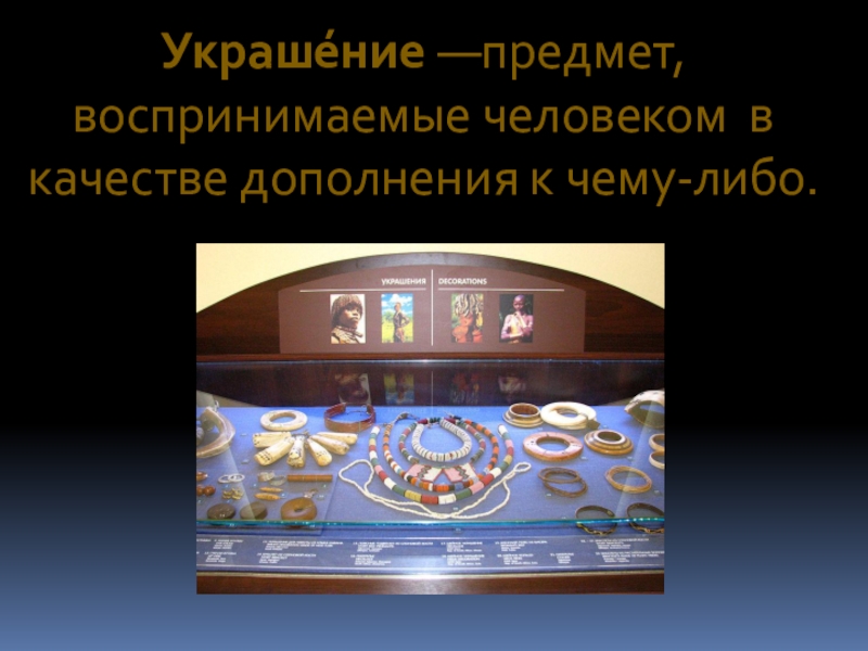 Слайд 2Украше́ние —предмет, воспринимаемые человеком в качестве дополнения к чему-либо.