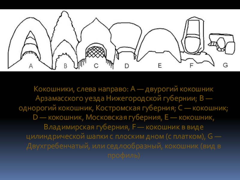 однорогий кокошник, Костромская губерния; C — кокошник; D — кокошник, Московская губерния, Е — кокошник, Владимирская губерния, F — кокошник в виде цилиндрической шапки с плоским дном (с платком), G — Двухгребенчатый, или седлообразный, кокошник (вид в профиль)