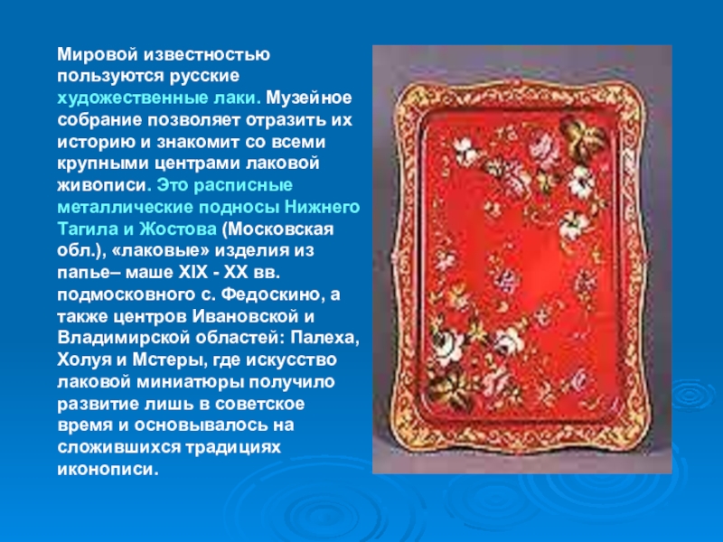 Слайд 12Мировой известностью пользуются русские художественные лаки. Музейное собрание позволяет отразить их