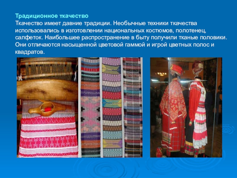национальных костюмов, полотенец, салфеток. Наибольшее распространение в быту получили тканые половики. Они отличаются насыщенной цветовой гаммой и игрой цветных полос и квадратов.