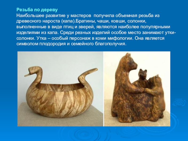 нароста (капа).Братины, чаши, ковши, солонки, выполненные в виде птиц и зверей, являются наиболее популярными изделиями из капа. Среди резных изделий особое место занимают утки-солонки. Утка – особый персонаж в коми мифологии. Она является символом плодородия и семейного благополучия.