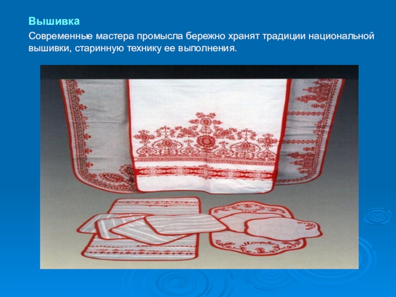 Слайд 10Современные мастера промысла бережно хранят традиции национальной вышивки, старинную технику ее