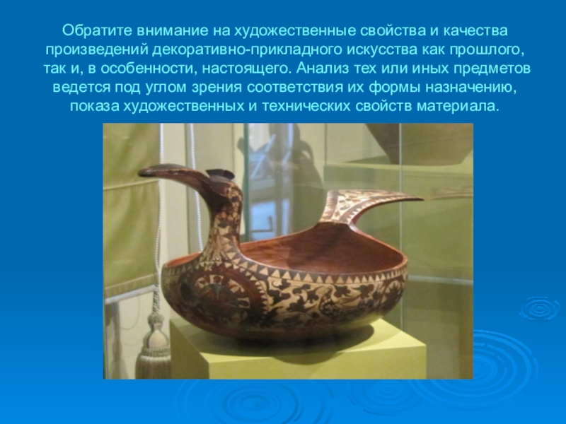 Слайд 15Обратите внимание на художественные свойства и качества произведений декоративно-прикладного искусства как