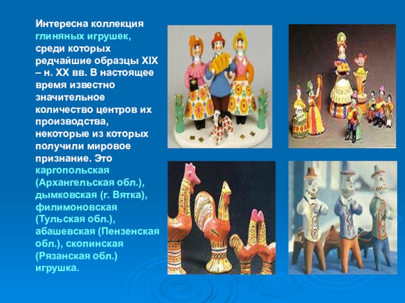 XX вв. В настоящее время известно значительное количество центров их производства, некоторые из которых получили мировое признание. Это каргопольская (Архангельская обл.), дымковская (г. Вятка), филимоновская (Тульская обл.), абашевская (Пензенская обл.), скопинская (Рязанская обл.) игрушка.