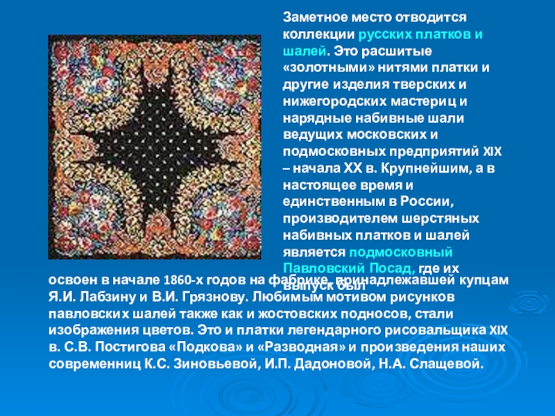 нитями платки и другие изделия тверских и нижегородских мастериц и нарядные набивные шали ведущих московских и подмосковных предприятий XIX – начала ХХ в. Крупнейшим, а в настоящее время и единственным в России, производителем шерстяных набивных платков и шалей является подмосковный Павловский Посад, где их выпуск был