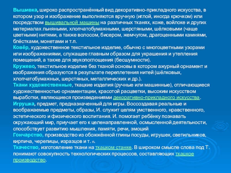 Слайд 27Вышивка, широко распространённый вид декоративно-прикладного искусства, в котором узор и изображение