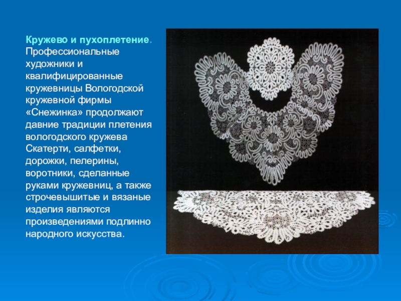 Слайд 9Кружево и пухоплетение. Профессиональные художники и квалифицированные кружевницы Вологодской кружевной фирмы