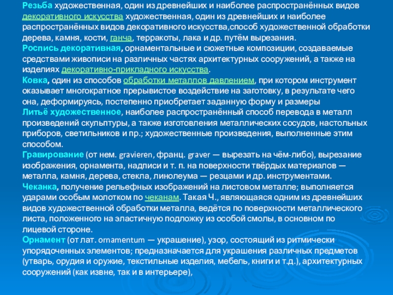 Слайд 28Резьба художественная, один из древнейших и наиболее распространённых видов декоративного искусства