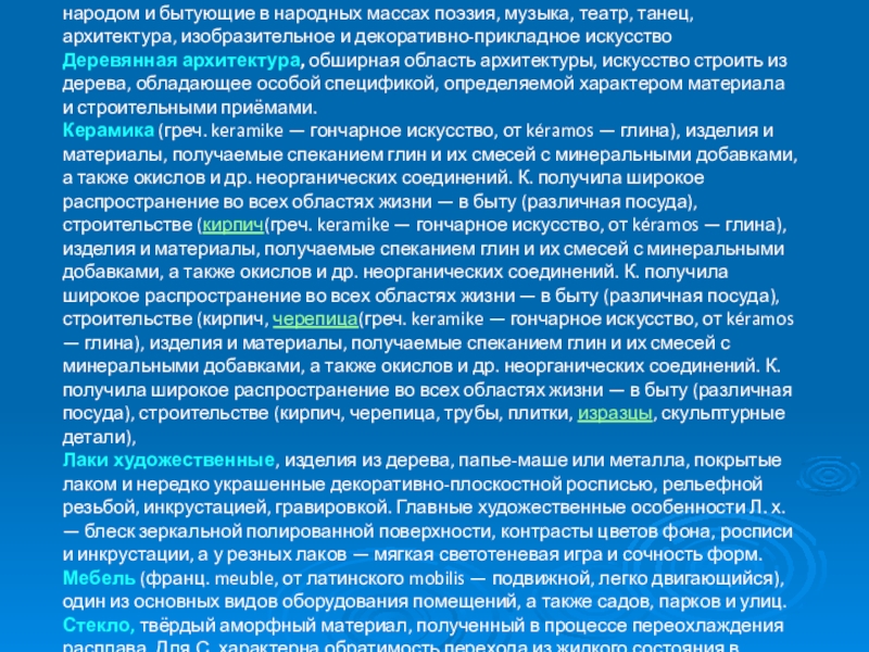 создаваемые народом и бытующие в народных массах поэзия, музыка, театр, танец, архитектура, изобразительное и декоративно-прикладное искусство