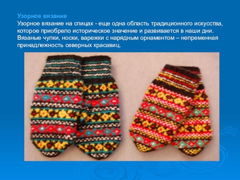 которое приобрело историческое значение и развивается в наши дни. Вязаные чулки, носки, варежки с нарядным орнаментом – непременная принадлежность северных красавиц.