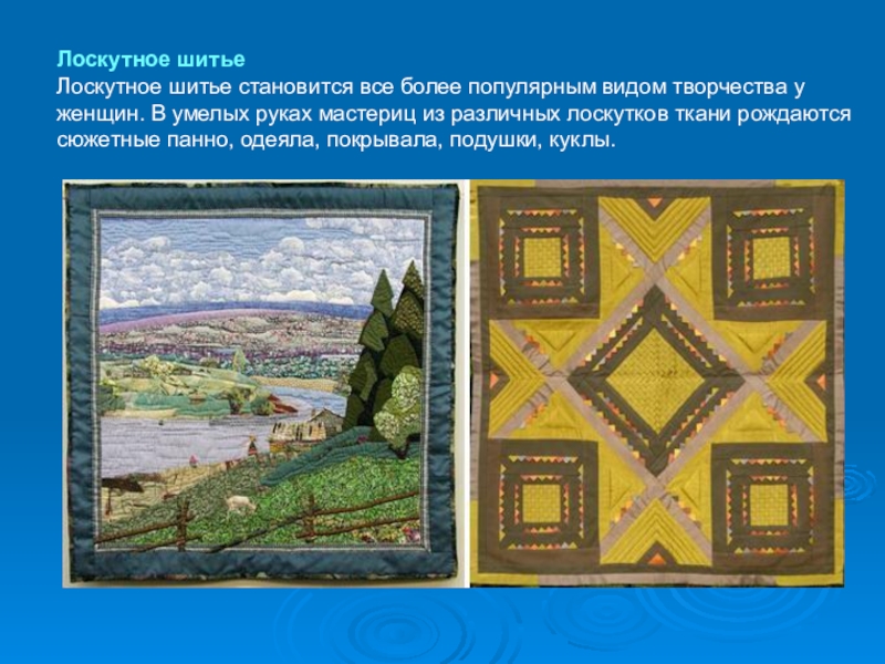 В умелых руках мастериц из различных лоскутков ткани рождаются сюжетные панно, одеяла, покрывала, подушки, куклы.