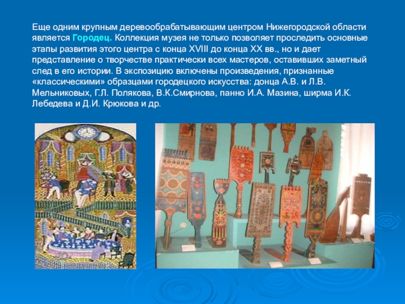 Слайд 7Еще одним крупным деревообрабатывающим центром Нижегородской области является Городец. Коллекция музея
