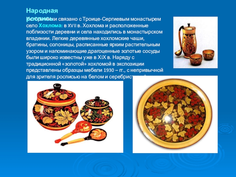 Слайд 6Исторически связано с Троице-Сергиевым монастырем село Хохлома: в XVII в. Хохлома