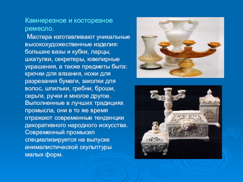 вазы и кубки, ларцы, шкатулки, секретеры, ювелирные украшения, а также предметы быта: крючки для вязания, ножи для разрезания бумаги, заколки для волос, шпильки, гребни, броши, серьги, ручки и многое другое. Выполненные в лучших традициях промысла, они в то же время отражают современные тенденции декоративного народного искусства. Современный промысел специализируется на выпуске анималистической скульптуры малых форм.