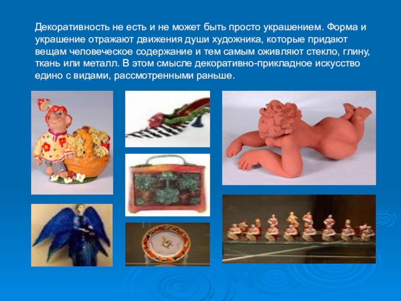 украшение отражают движения души художника, которые придают вещам человеческое содержание и тем самым оживляют стекло, глину, ткань или металл. В этом смысле декоративно-прикладное искусство едино с видами, рассмотренными раньше.