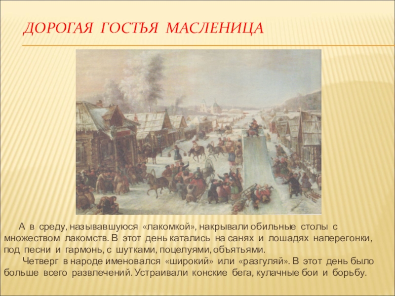 множеством лакомств. В этот день катались на санях и лошадях наперегонки,