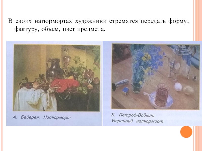 Слайд 5В своих натюрмортах художники стремятся передать форму, фактуру, объем, цвет предмета.