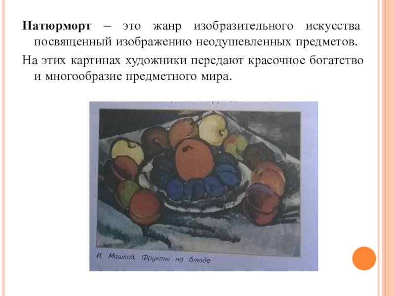 Слайд 4Натюрморт – это жанр изобразительного искусства посвященный изображению неодушевленных предметов.