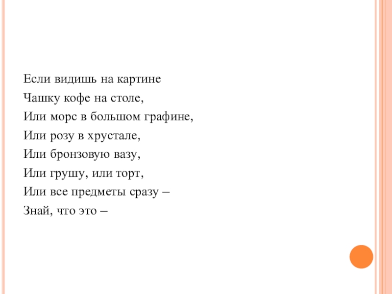 Если видишь на картинеЧашку кофе на столе, Или морс в большом графине, Или розу в хрустале, Или бронзовую вазу,Или грушу, или торт, Или все предметы сразу – Знай, что это –