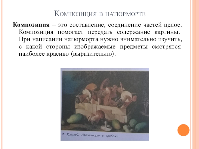 Композиция в натюрмортеКомпозиция – это составление, соединение частей целое. Композиция помогает передать содержание картины. При написании натюрморта