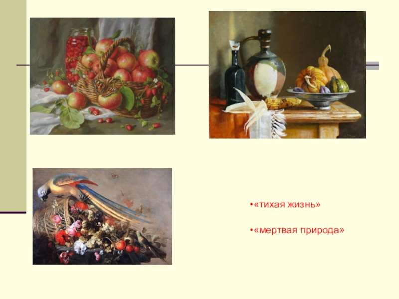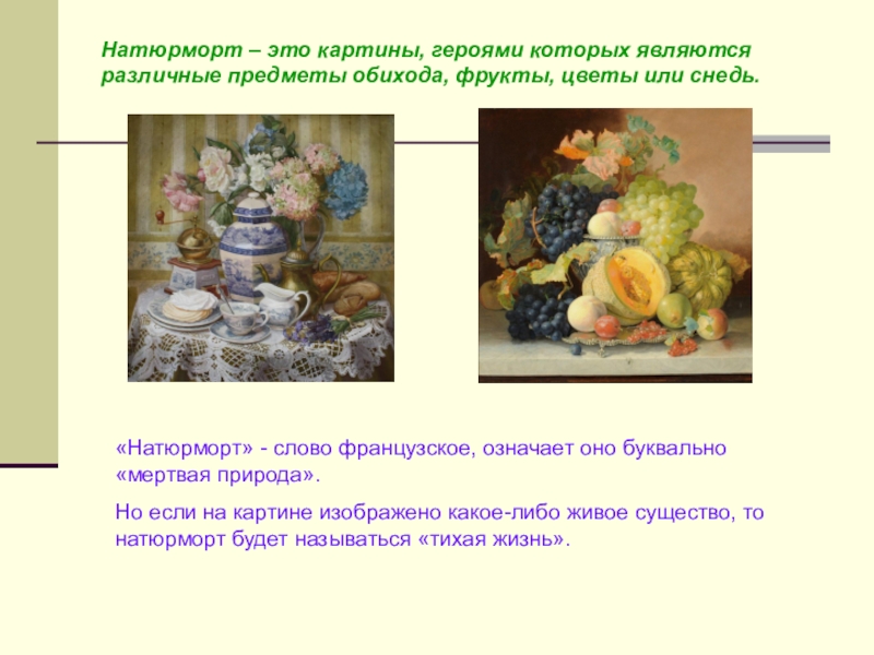 Но если на картине изображено какое-либо живое существо, то натюрморт будет называться «тихая жизнь».