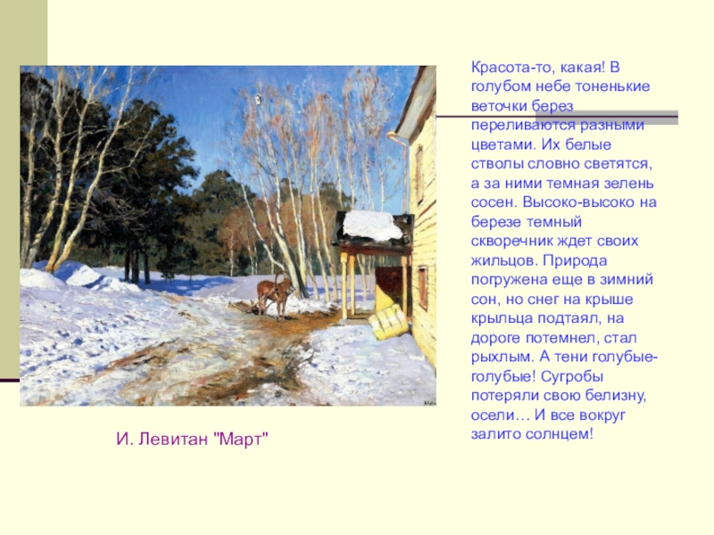 Типичный для России средней полосы пейзаж. В картине одновременно и печаль, и радость, и улыбка, и раздумье… На еще голых ветках покривившихся берез множество грачиных гнезд, вокруг которых суетятся сами хозяева птичьего поселка. Прозрачный свежий воздух чувствуется в высоких, нежно-голубеющих облаках. Поблескивает синевой освободившийся ото льда пруд. Художник так написал весну, что мы слышим не только грачиный гомон, но и ощущаем движение, обновление жизни и запах весны. Картина написана в холодном колорите с преобладанием серых и серо-голубых тонов.