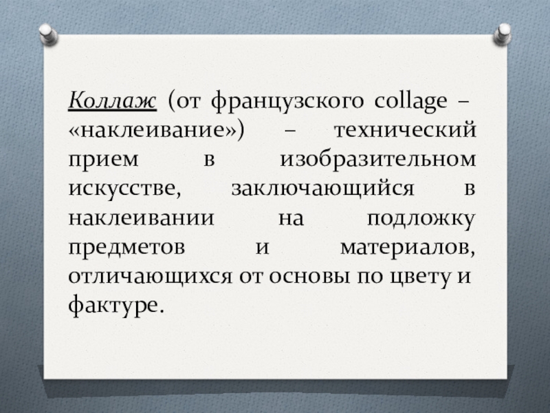 Коллаж (от французского collage – «наклеивание») – технический прием в изобразительном искусстве, заключающийся в наклеивании на подложку