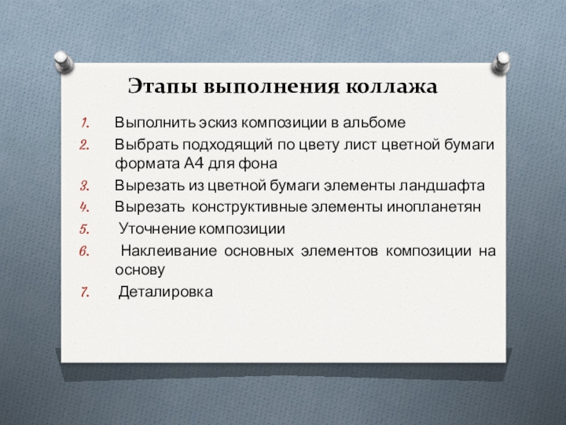 Этапы выполнения коллажаВыполнить эскиз композиции в альбомеВыбрать подходящий по цвету лист цветной бумаги формата А4 для фонаВырезать
