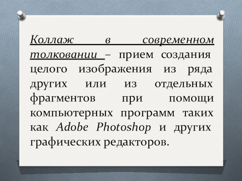 Коллаж в современном толковании – прием создания целого изображения из ряда других или из отдельных фрагментов при